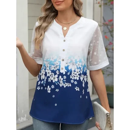 Women’s Shirt Blouse Floral Casual Half Sleeve Notched Neck Regular Tops Daily Mesh Patchwork Buttons Black Wine Blue Summer 2025