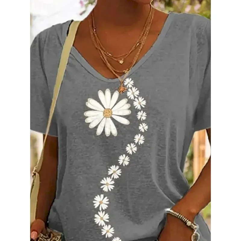 Women’s T Shirt Floral Casual Short Sleeve V Neck Regular Tops Daily Print Gray Summer 2025