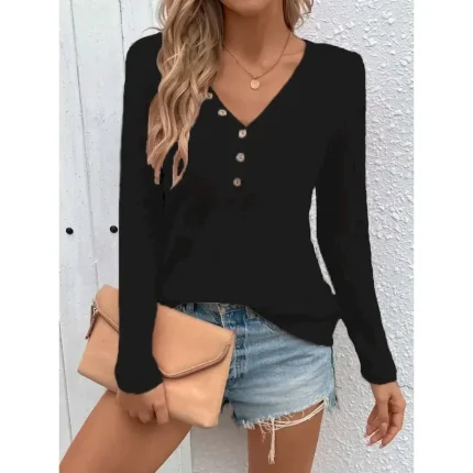 Women’s T Shirt Plain Fashion Modern Casual Long Sleeve V Neck Regular Tops Daily Weekend Buttons Black White Pink Spring Fall 2025